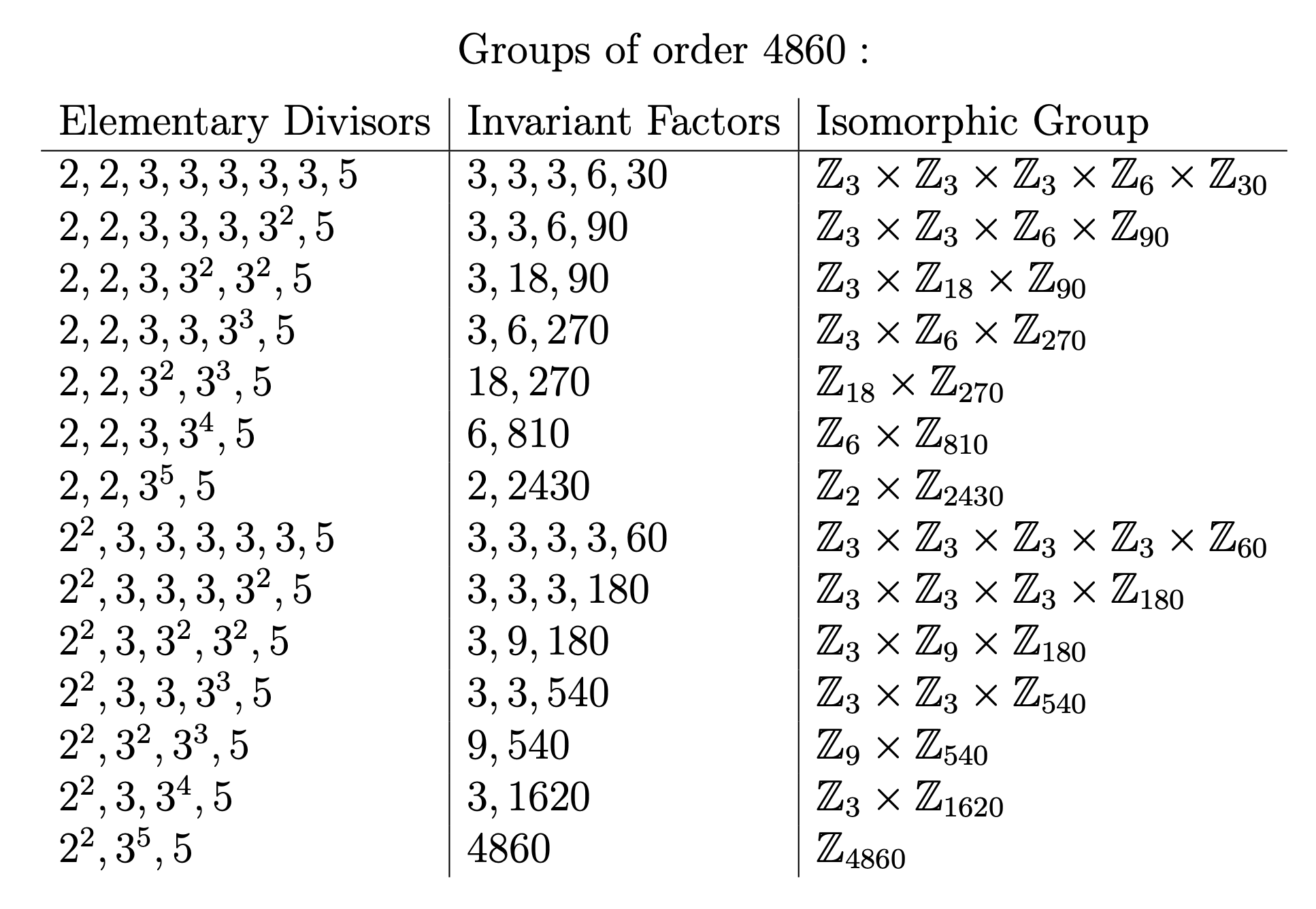 With this result, we’ve been handed the power to know every abelian group of a given order (size), using the prime factorization of that order. For example, we can factorize 36 as $2^2\cdot 3^2$, giving us four unique ways to write 36: