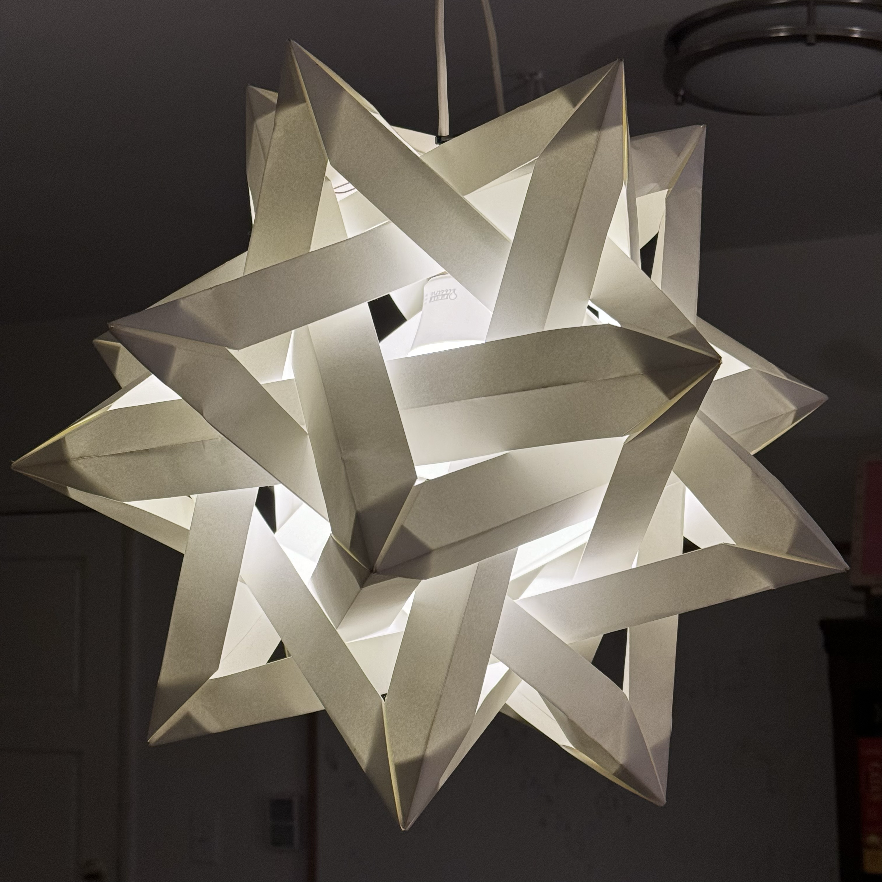 It’s made from 30 individual segments, each one pre-cut and creased by a laser. These 20-point stars are hard enough to assemble, so I was glad that I also didn’t have to do as much work on the folding. Vector engraving the creases also let me use heavy art paper, which is normally very unsuitable for origami and can’t be creased very well by hand.