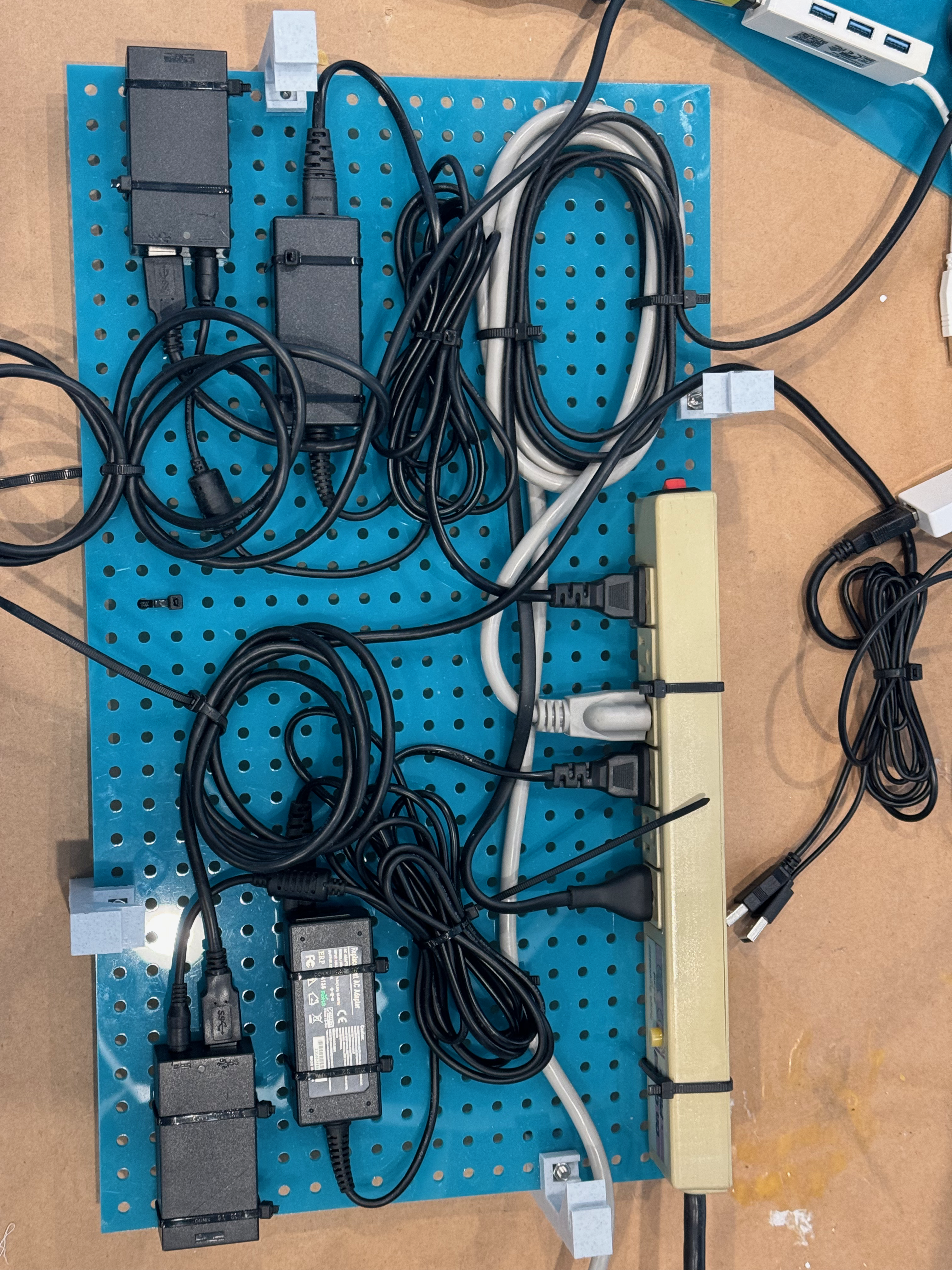 The first version of the display had a wood frame, with elastic holding the strips in place. It worked well enough, but the strips would constantly get pulled loose or start slipping out under their own weight and have to be tightened again. All of the electronics including the computer that drove this setup were mounted on a sandwich of laser-cut acrylic, with 3D printed standoffs holding the two pieces apart: