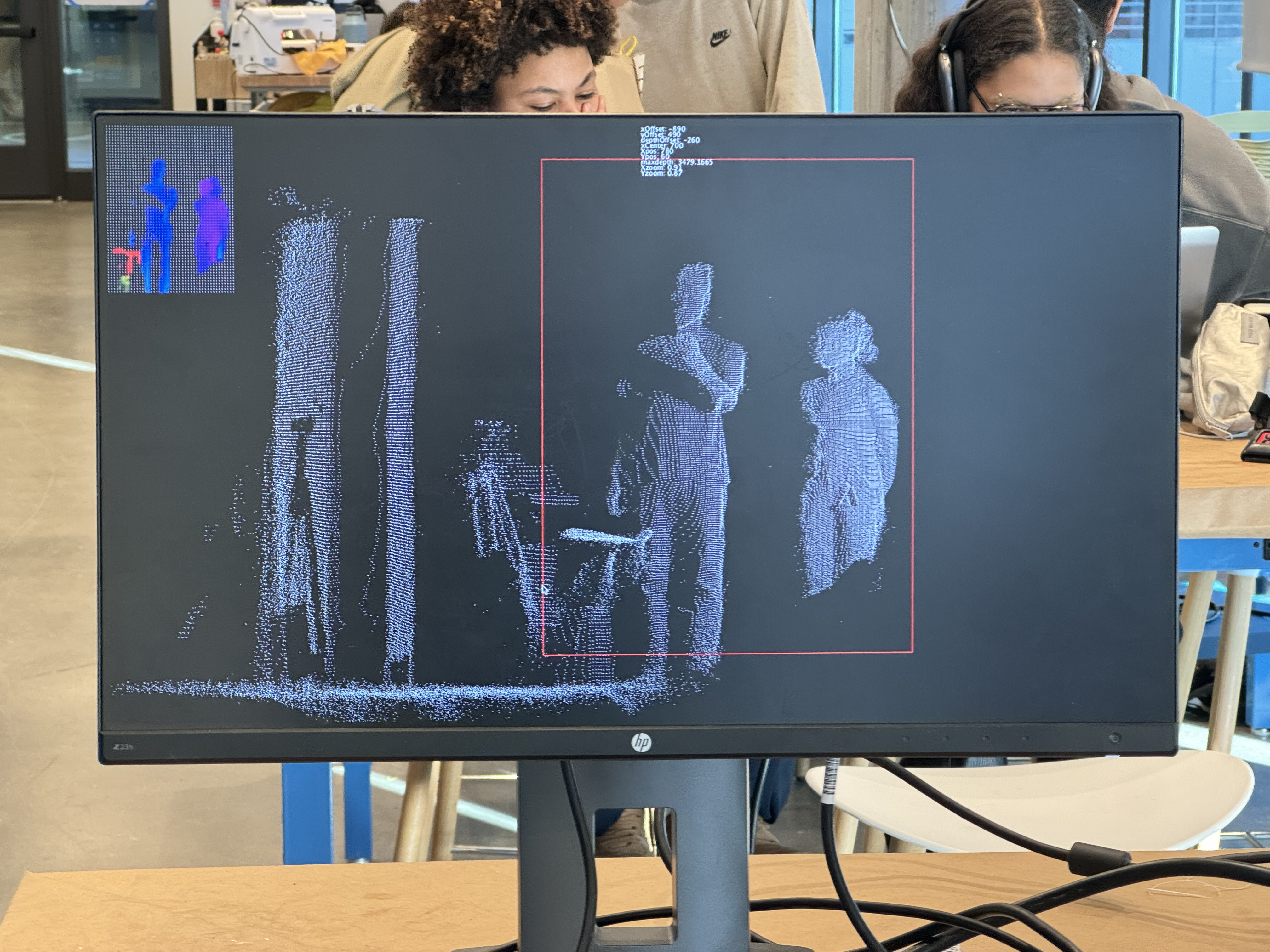 However, placing a suitable time-of-flight sensor on each pixel would increase the cost by an order of magnitude. So I stuck with the Kinect sensors and worked backwards from this ideal form to write the software. The final image displayed on the 45x60 panel is essentially a 2D histogram of the point cloud: each pixel has its own square tube projecting out from it, and all of the points that get caught in that tube are added to its bucket.